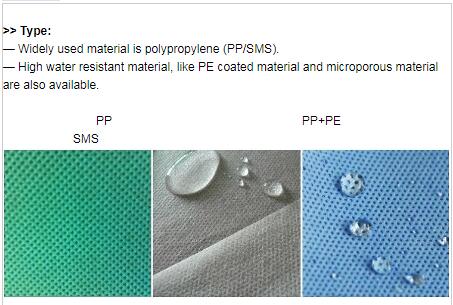 Material : PP / PE/PP+PE film/ SMS / SMMS / Spunlace / Microporous or other